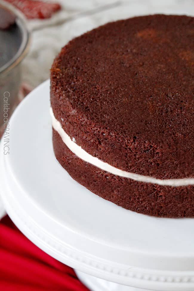 - Peppermint Frosting: Beat butter at medium speed with an electric mixer until creamy, about 1 minute. Add powdered sugar and mix on medium speed for 1-2 minutes. Pour in heavy cream, vanilla and peppermint extract. Mix on high for 3-4 minutes until fluffy. If filling is way too thick, add a couple more teaspoons of heavy cream. When cake has cooled, frost the bottom cake layer with the frosting, leaving ½ border around the edge and place in the refrigerator to set, about 30 minutes.