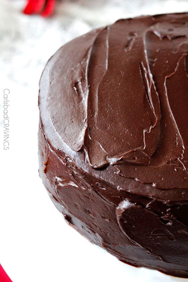 The Chocolate Peppermint Cake is then coated in velvety Chocolate Ganache Frosting. Heavy cream, butter and melted chocolate thats been whipped into frosting. Who can resist chocolate ganache frosting?!
