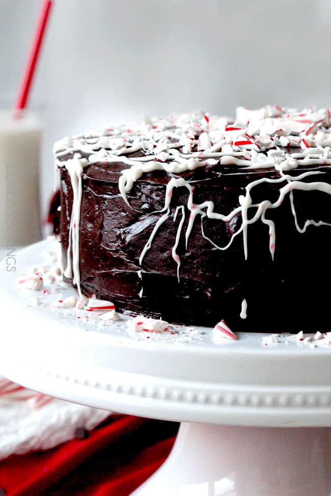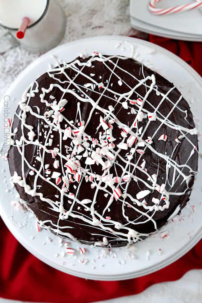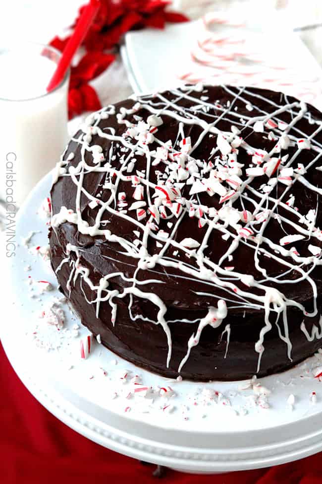 Finally, the Chocolate Peppermint Cake is drizzled with melted peppermint candy melts and crushed candy canes because, after all, its Christmas and ribbons of peppermint will fill everyone with the Christmas spirit!
