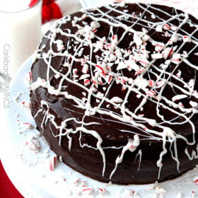 - Optional Garnish: Melt peppermint candy melts at MEDIUM (50% power) until mostly melted then stir until smooth. Stir in 1 teaspoon shortening and add to a plastic bag, snip the corner and drizzle over cake. Garnish with crushed candy canes.