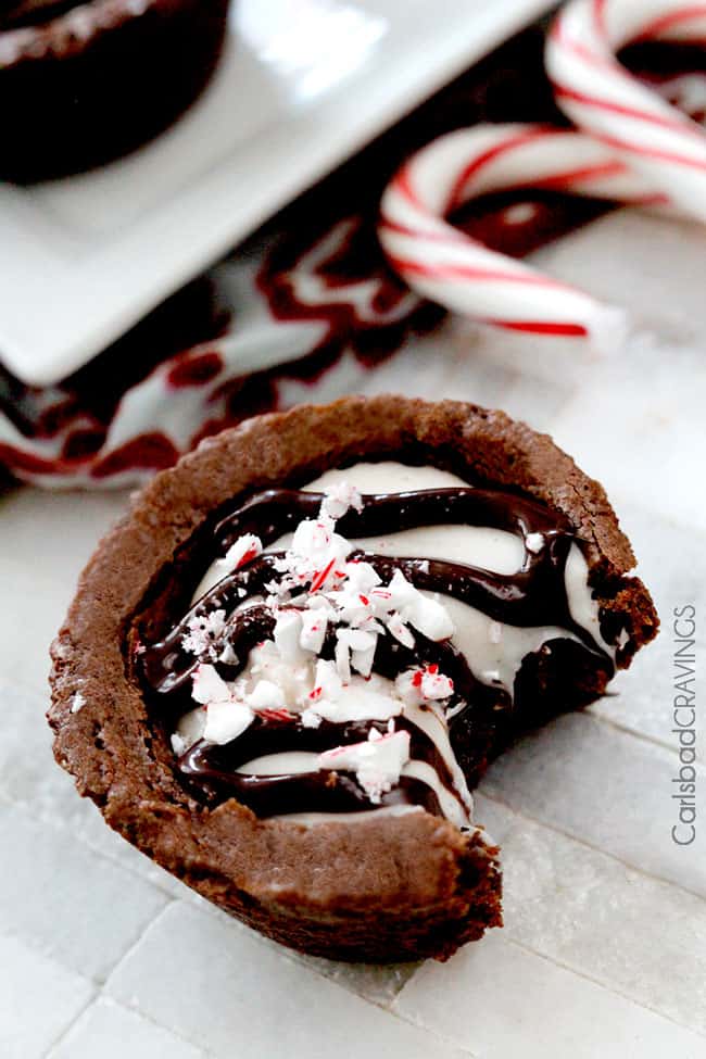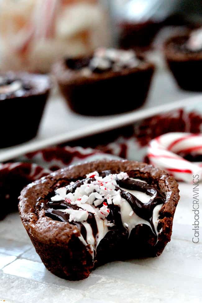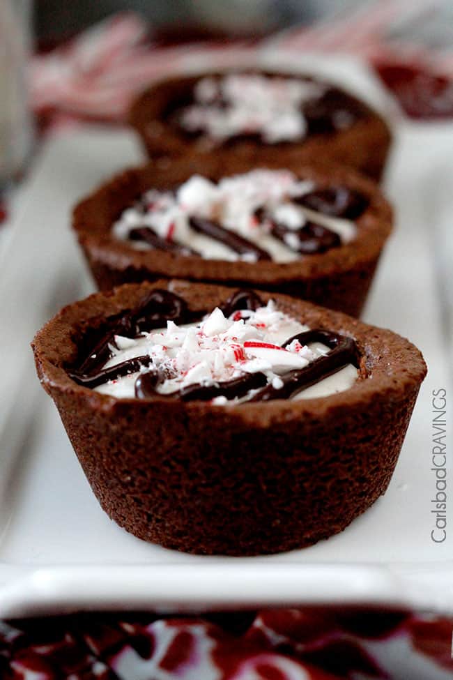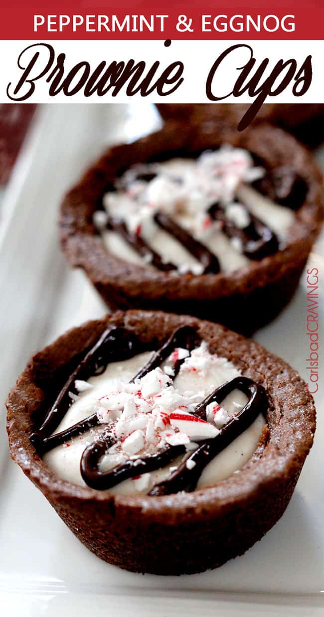 Then drizzle the cups with more melted chocolate and candy canes and Christmas cheer in a cup is born. Now if you can’t wait to devour your brownie cups, the eggnog layer will be gooey and melty and delicious. If you wait for the layer to harden, it tastes like delectable eggnog chocolate bark. Both amazing. Both perfectly compliment the moist, soft peppermint chocolate brownies.