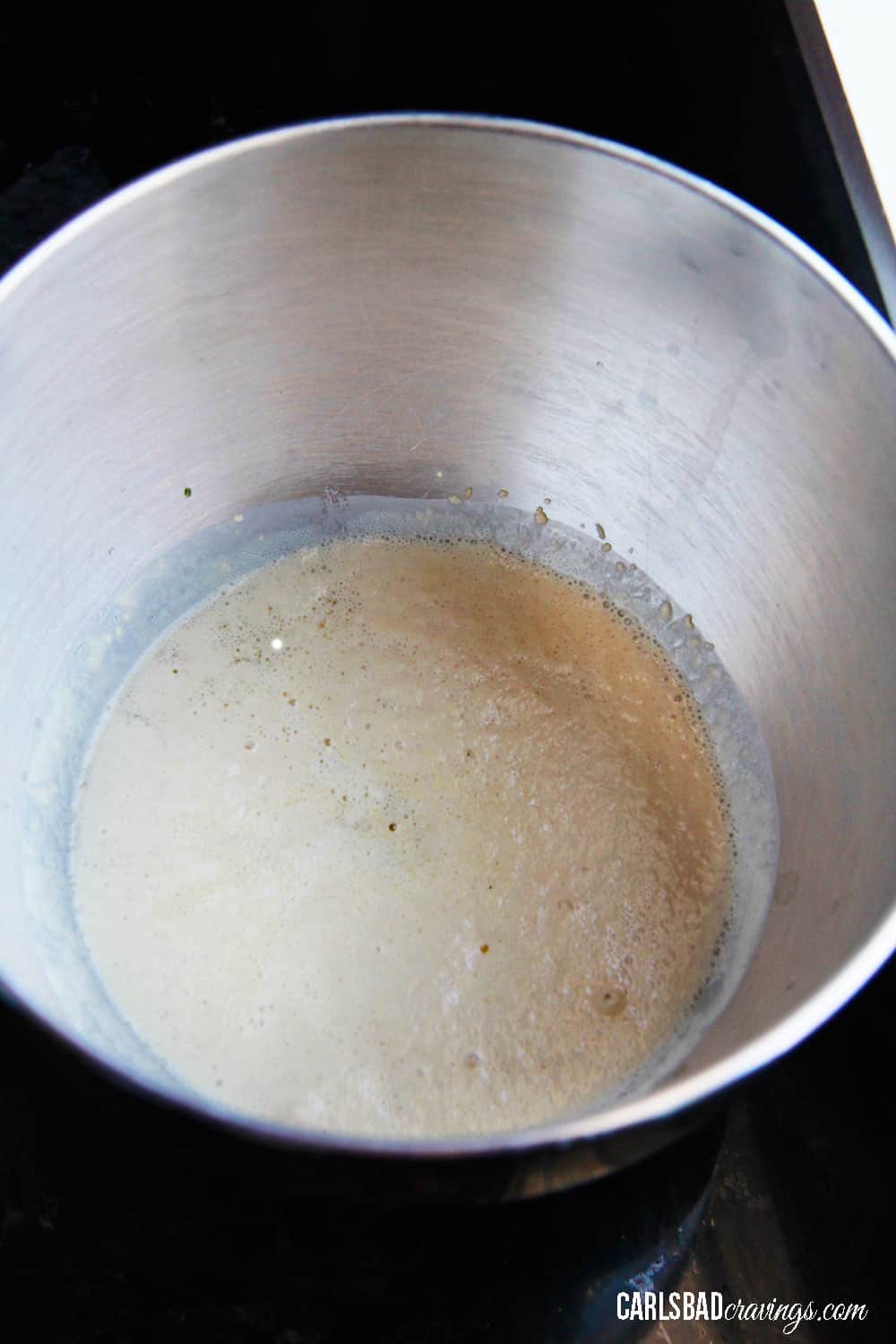 In a large mixing bowl or the bowl of your stand mixer (preferred), stir in the warm water, sugar, and yeast. Letit sit for 5-10 minutes or until the yeast is foamy and dissolved. If the yeast doesn’t foam, either your water was too warm or your yeast is too old. Yeast should be no older than 6 months, and water should be around 105°F. Repeat until your yeast foams like this (which can take up to 10 minutes):