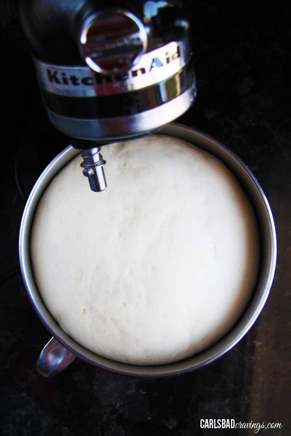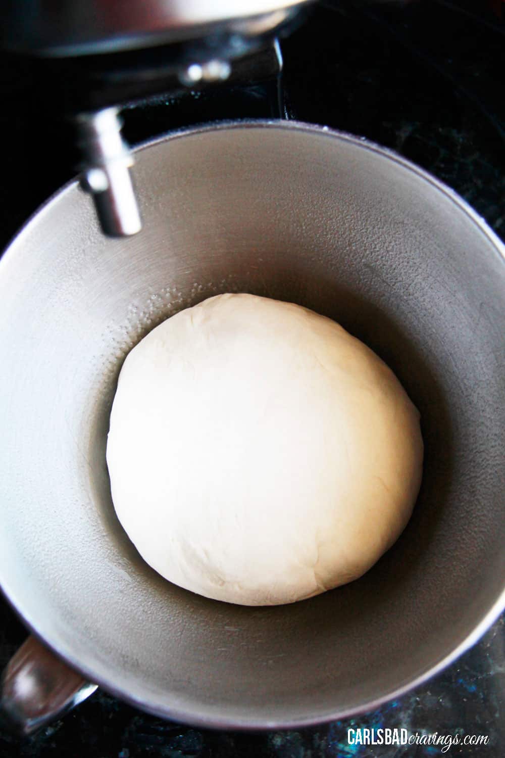 Once the dough has pulled away from the bowl, continue to mix for 5 more minutes on medium-low speed (or by hand). You may need to place a hand on your mixer so it doesn’t fly off your counter!
