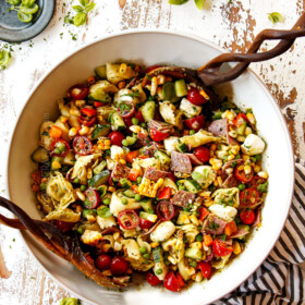 This Pesto Pasta Salad recipe is summer in a bowl! It’s bursting with pillowy cheese tortellini (or your favorite corkscrew pasta), sweet, juicy cherry tomatoes, crisp cucumbers, crunchy bell peppers, charred, caramelized sweet corn, zippy red onions, bright, meaty salami and buttery pearls of fresh mozzarella all doused in a bright herby, garlicky pesto vinaigrette. It’s a hypnotic blend of fresh, vibrant, hearty and comforting flavors and creamy, crunchy and crispy textures. Of course, you can omit ingredients or swap in your favs to make it YOUR favorite pesto pasta salad recipe! This pesto pasta salad can be served as a main dish or as a side and is always a crowd pleaser for potlucks, picnics and parties. It’s a quick chop and throw together recipe that can be made 100% percent ahead of time for the perfect stress-free side!