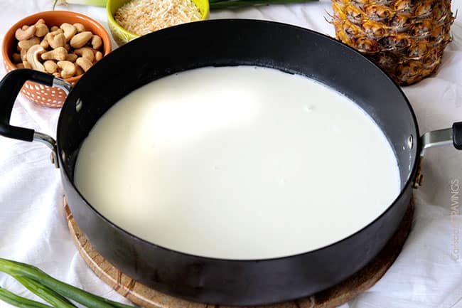 - Drain the juice from one can of crushed pineapple, then add coconut milk to equal 3 cups.