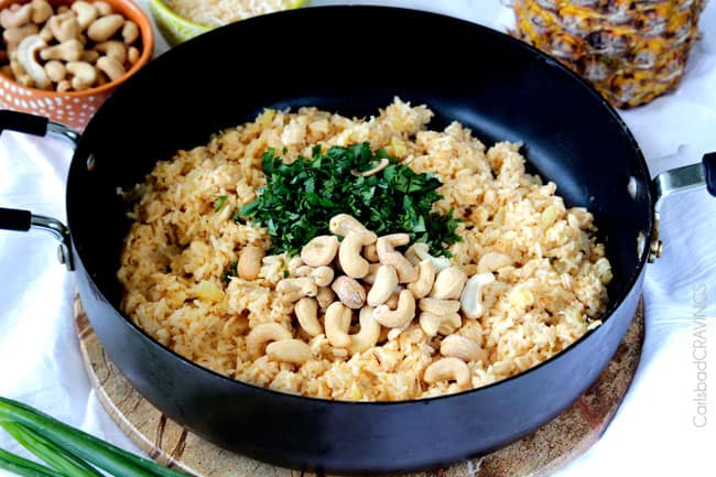 - Just before serving (so the lime doesn’t get lost), stir in the cilantro and lime juice to balance the sweet pineapple. Then, add the roasted, salted cashews to add a depth of nuttycrunch.