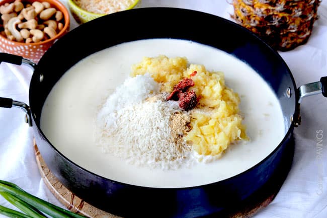 - Add the rice, crushed pineapple, Thai red curry paste, coconut flakes, ground ginger, garlic, onion, salt, and pepper.