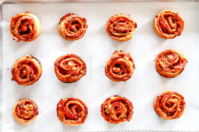 - Place each pinwheel, cut side up, on prepared baking sheet. Bake at 375 degrees F for 25-30 minutes or until dough is golden. Remove from oven and let cool for 5 minutes before removing pinwheels from pan to a wire rack. The Pizza Pinwheels will be a little soft at first but will firm up as they cool. Garnish with fresh parsley and serve with remaining warmed pizza sauce if desired.