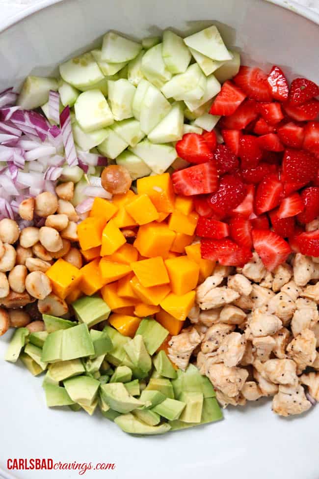 This Chicken Fruit Salad is loaded with chicken, strawberries, mangoes, cucumbers and avocado marinated in sweet, tangy poppy seed dressing topped with toasted coconut and macadamia nuts. It can be served plain or in fresh lettuce wraps, buttery croissants or tender wraps. You can prep the chicken fruit salad ahead of time for a stress free, make ahead lunch or party appetizer that everyone will love!