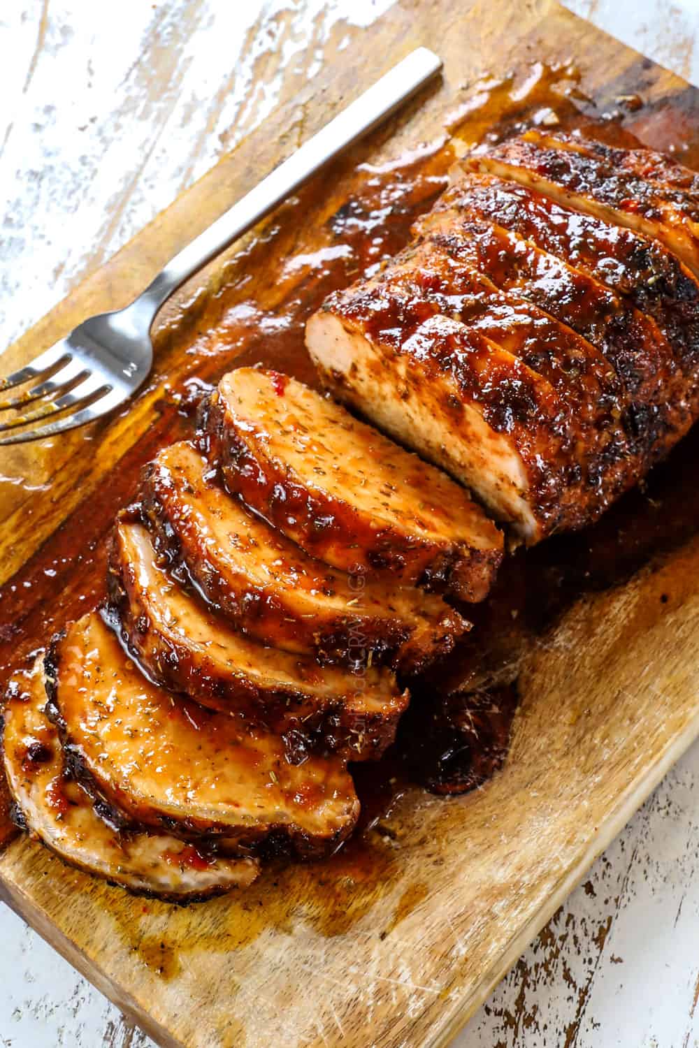 Transfer pork to a cutting board, let rest for 15 minutes before slicing, then slather with reserved sauce.