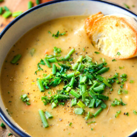 Potato Leek Soup has to be one of our all-time favorite soups. It’s a creamy, comforting hug of velvety goodness bursting with layers of flavor with minimal effort that you will crave. It truly is one of life’s greatest culinary pleasures – and now you can enjoy it even more because this recipe is made without any cream! It tastes beautifully decadent and restaurant elegant but is naturally thickened by its own puree which means you can slurp on and on and on…