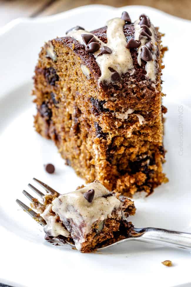 Moist, rich Chocolate Chip Pumpkin Cake infused with chocolate and bathed in in Cinnamon Pumpkin Cream Cheese Glaze is SO good! The only cake you need for Fall!