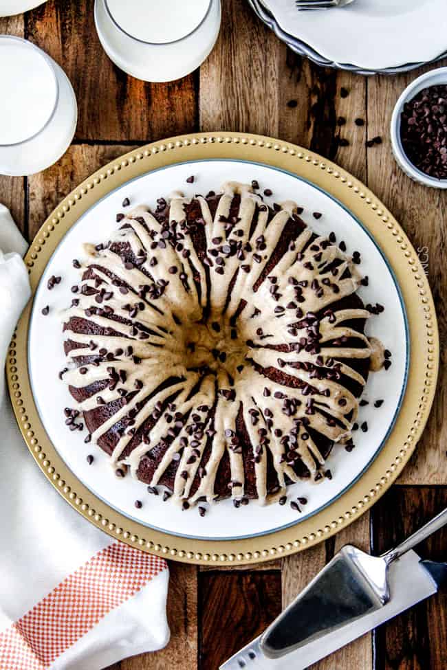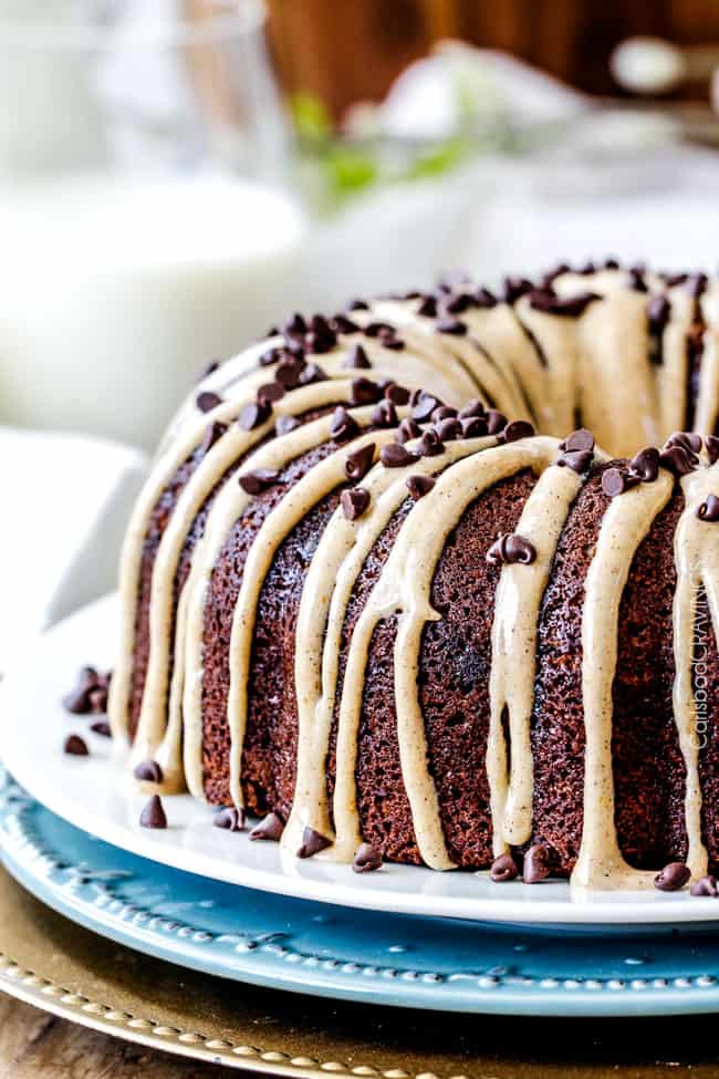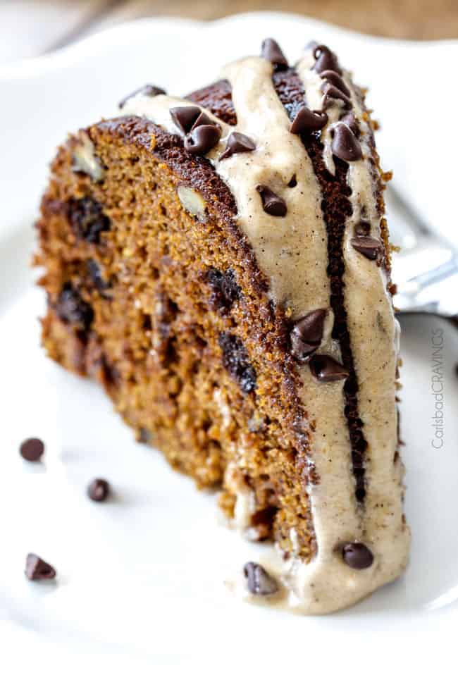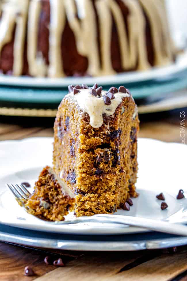 The multi-dimensional silky Cinnamon Pumpkin Cream Cheese Glaze pushes this Pumpkin Bundt Cake over the delicious edge into the crazy delicious arena where everyone will be beg you for the recipe.  The glaze is a simple combination of cinnamon, pumpkin puree, cream cheese and powdered sugar that enhances the Fall spiced pumpkin cake.  I love to warm my slice(s) of cake for 15 seconds or so not only is the chocolate studded cake warm but the the glaze is all warm, ooey, and gooey and irresistible!