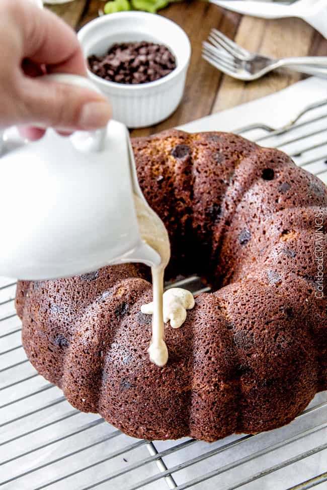 showing how to make Pumpkin Bundt Cake by drizzling Cream Cheese Glaze over cake