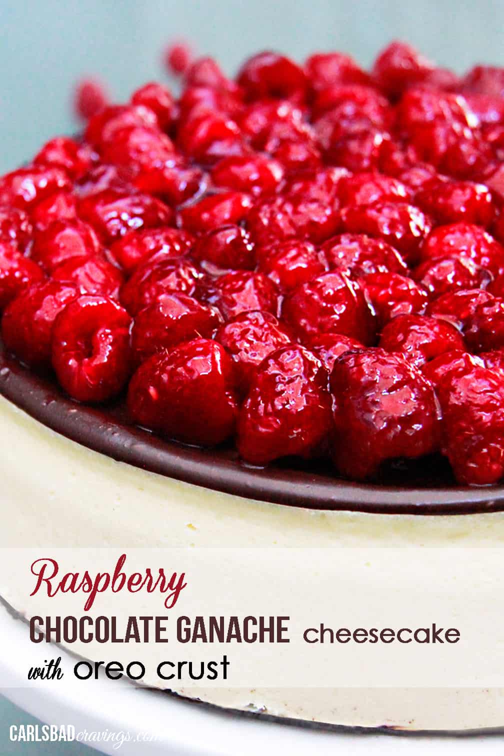I wanted to create a cheesecake that embodied our favorite raspberry filled chocolates which led to this Chocolate Raspberry Cheesecake recipe crusted in buttery oreos, topped with sweet, super creamy cheesecake (seriously, the texture just kills me – it’s melt in your mouth, savor on your tongue cheesecake!), covered with a thick bittersweet/semisweet chocolate ganache sure to satisfy every chocolate lover! (and don’t let the word ganache scare you – its as simple as melting cream and butter in the microwave and adding some chocolate!)…all topped with sweet raspberries chilled with raspberry jelly for the ULTIMATE Chocolate Raspberry Cheesecake experience.