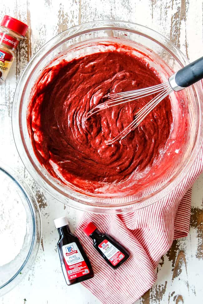 The Red Velvet Brownies are as easy as whisking your dry ingredients together and whisking your butter, sugar, cocoa powder, McCormick Pure Vanilla Extract, McCormick Peppermint Extract, red food coloring and eggs together, and then folding them together.