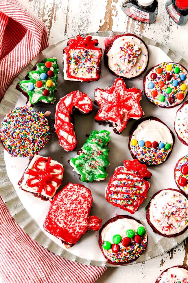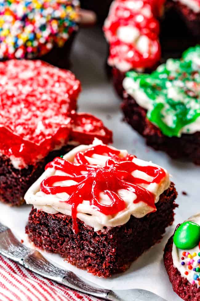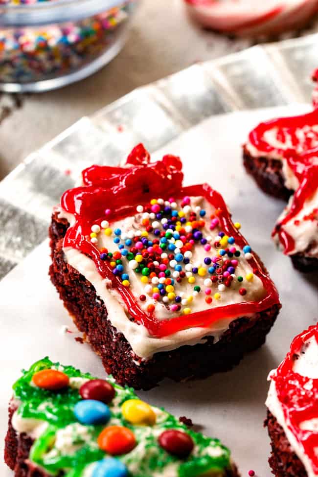 As far as making these Peppermint Red Velvet Brownies even more festive, you can either garnish with crushed candy canes, frost your individual brownie squares like presents, cut into triangles and frost like Christmas trees, or use cookie cutters and cut them into festive shapes.