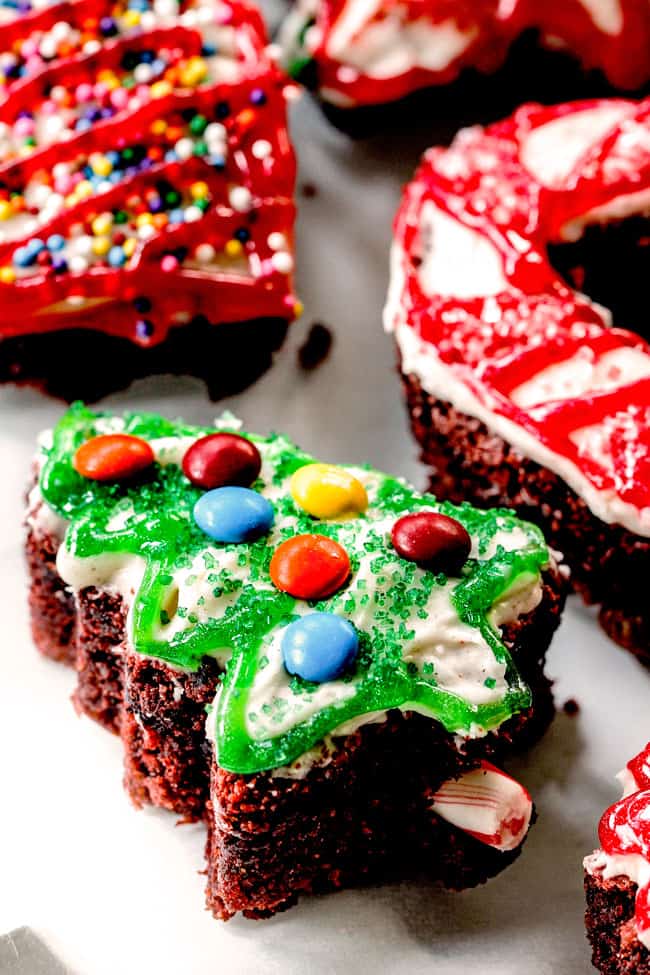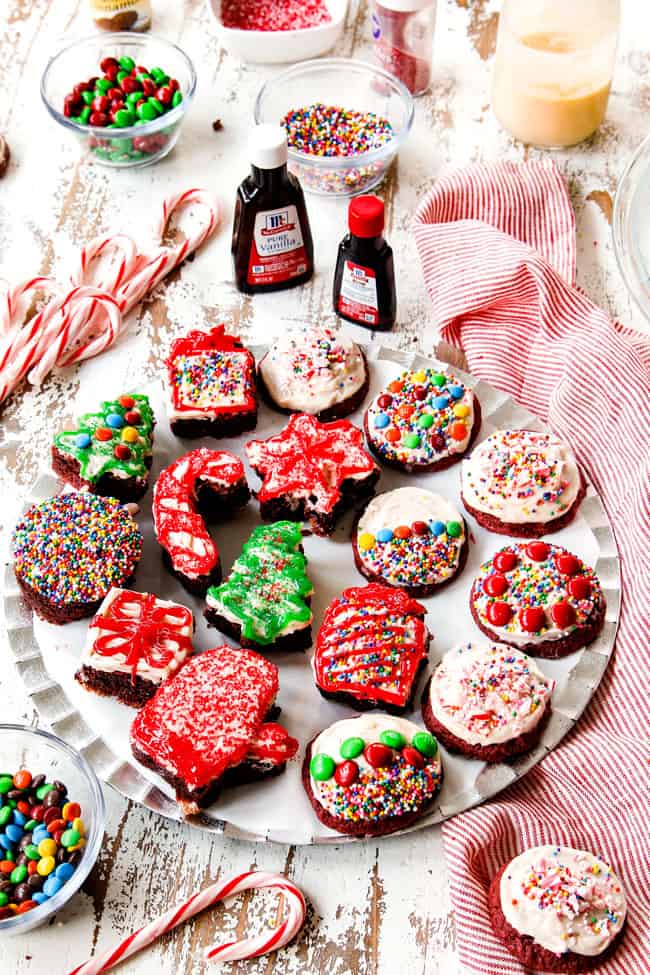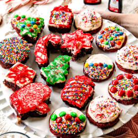- Frost cookies once completely cooled. Garnish with candy canes or sprinkles (optional). Brownies can be stored in an airtight container on the counter for 2 days, then refrigerated.