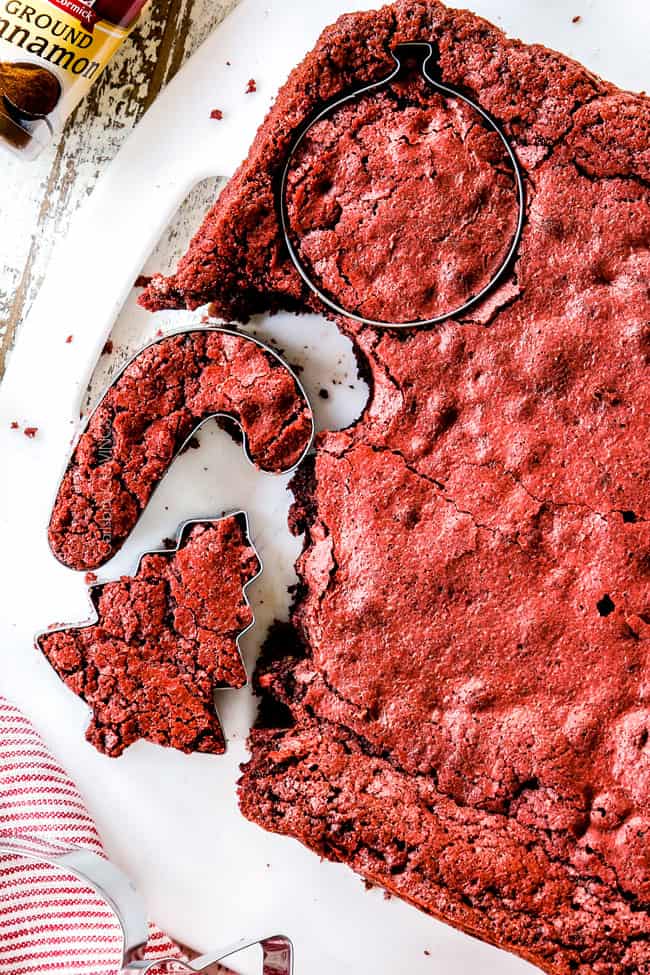 - Once cool, you can cut brownies into squares (presents), triangles (Christmas trees) or use cookie cutters to cut desired shapes.
