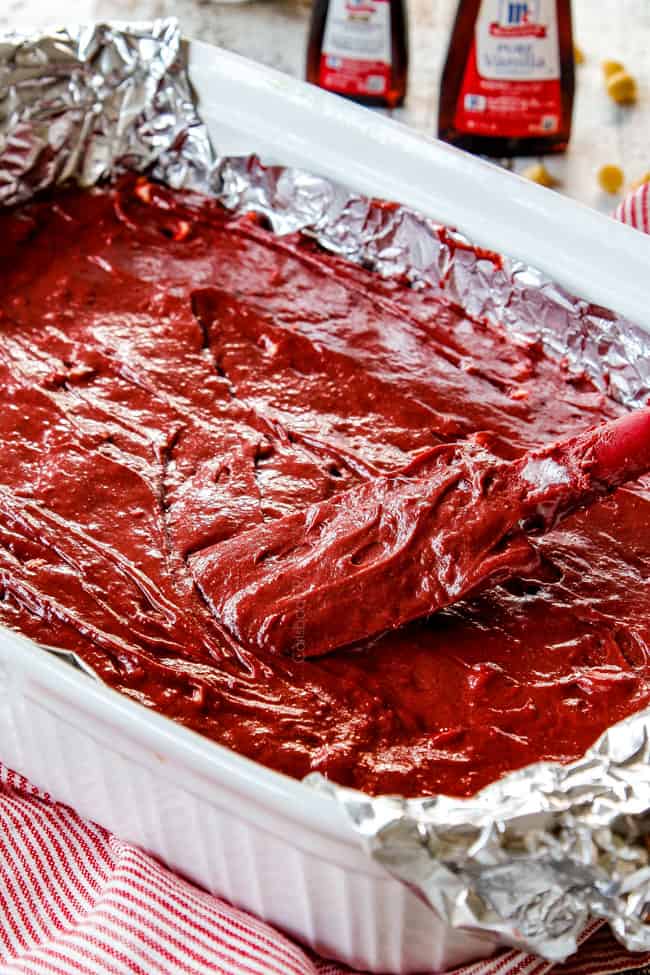 If you have ever wondered where “red velvet” comes from, it originated way before food coloring. Before food coloring, red velvet cakes were more scarlet. In fact, the color was created solely by a chemical reaction between the vinegar, cocoa and buttermilk (like the brownies below!).