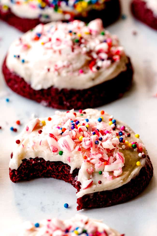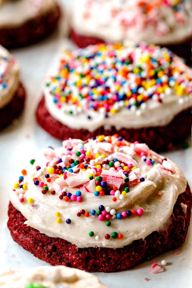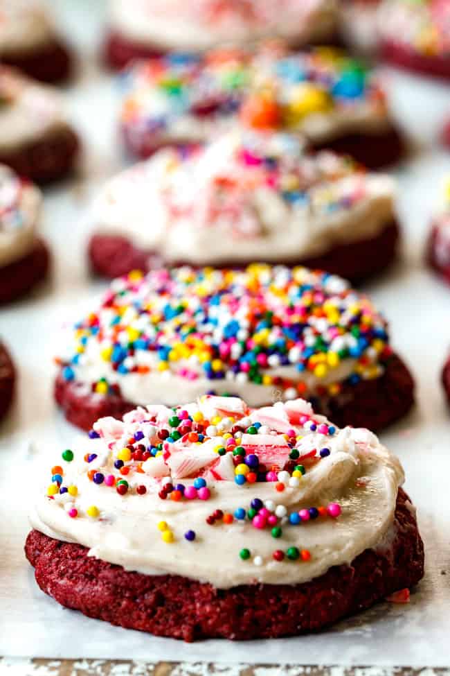 These Red Velvet Cookies are beautiful in their simplicity of contrasting white and red or you can dress them up with crushed candy canes, sprinkles candy or festive designs. The possibilities are endless – and so is the deliciousness!