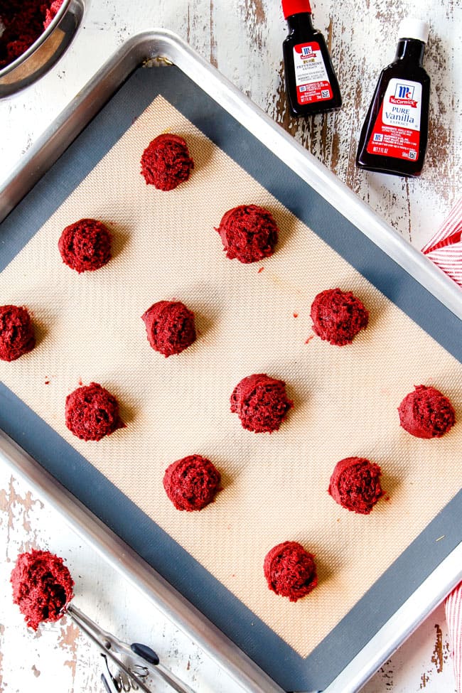 - Fit as many baked Red Velvet Cookies on a parchment/nonstick mat lined baking sheet without touching.