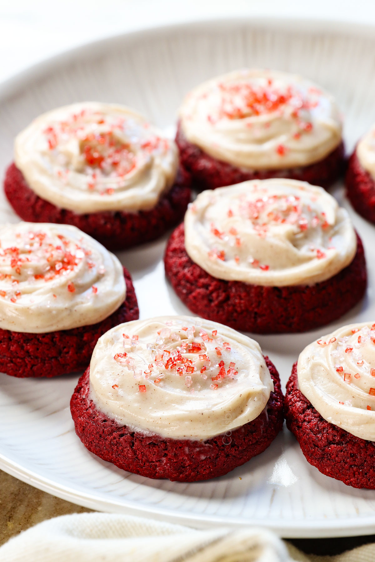 These Red Velvet Cookies are bursting with year-round delight, or infuse them with eggnog and peppermint extract for Christmas! They’re thick, red-velvet-soft, with chocolate undertones and craveable (eggnog) cream cheese frosting, making them a cut above the rest. Best of all, this recipe is shockingly easy to make with only 30 minutes of chilling time!