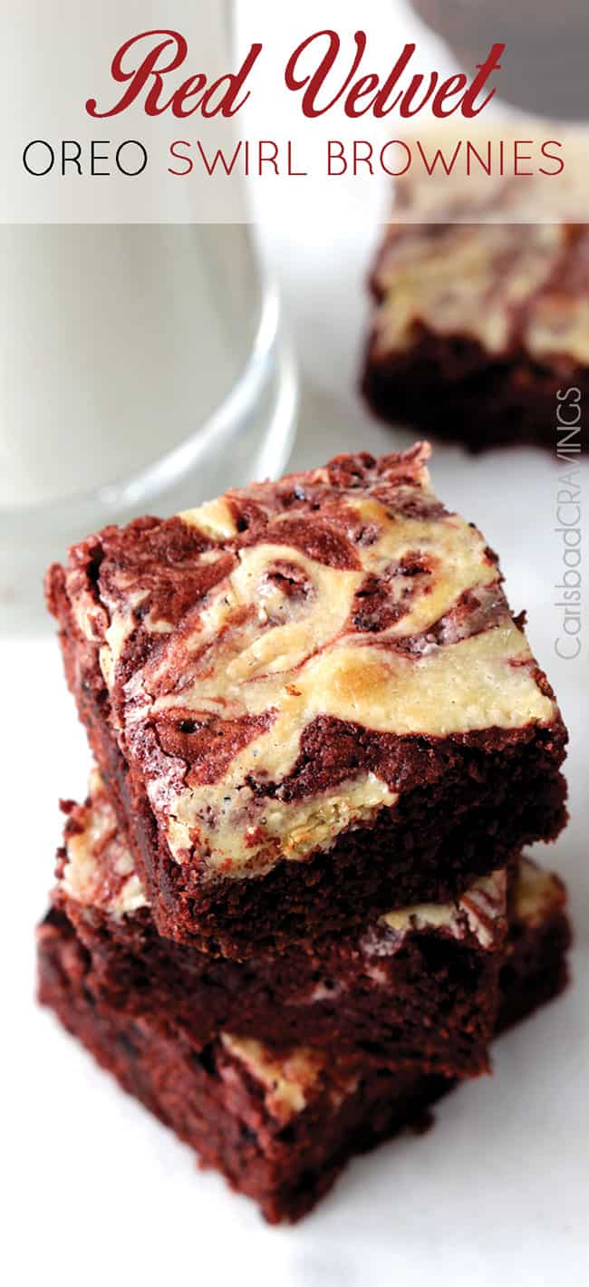 Now it’s your turn to create red velvet. Red Velvet Oreo Swirl Brownies. A pan of triple the love awaits you. Don’t leave it waiting.