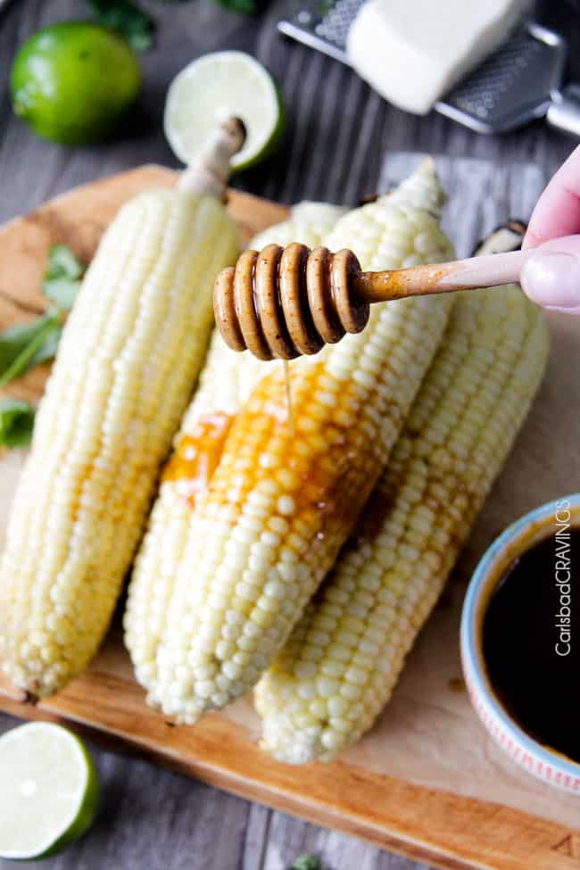 - When corn is cool enough to handle, remove husks and brush with Chipotle Honey Lime Butter. You can also add Chipotle Honey Lime Butter to a shallow dish and add corn and turn to coat.