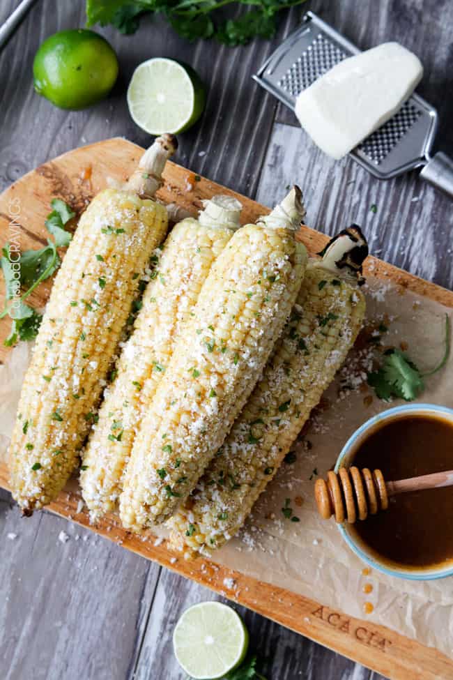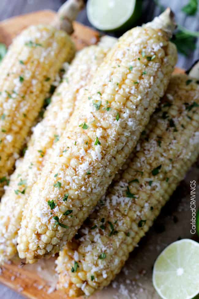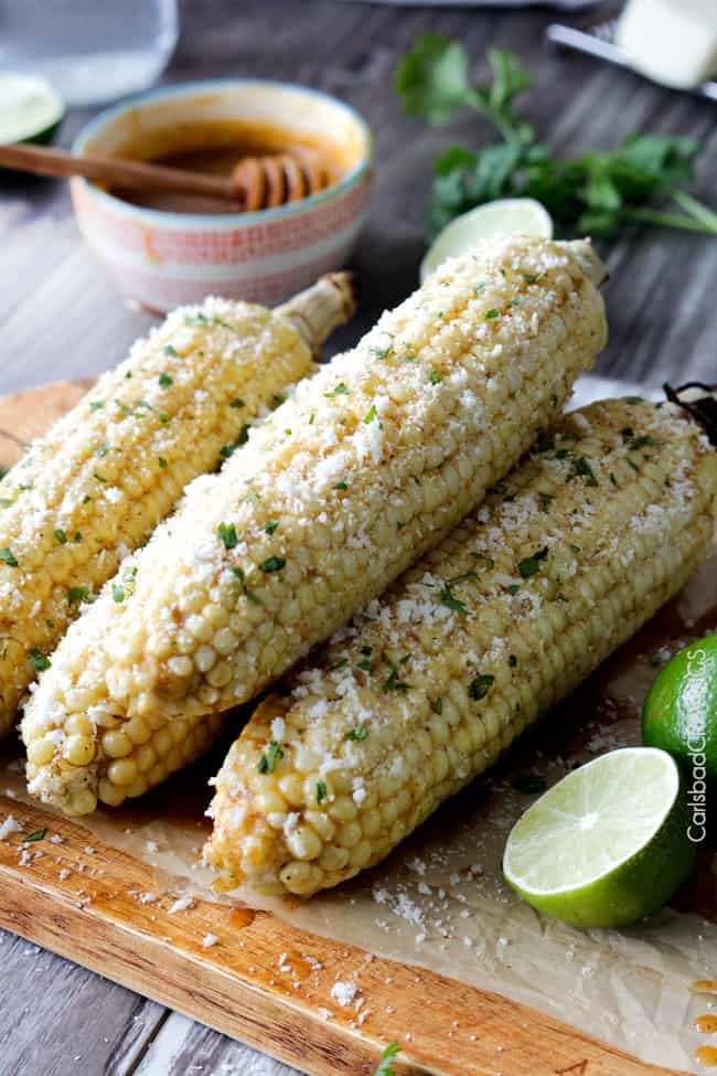 My personal favorite summer corn is Grilled Corn on the Cob with Husks on. The corn husks protect the corn from drying out by creating a protective barrier from the direct heat so the corn can steam in its own moisture while at the same time being infused with smoky flavor from the charring husks – winning!