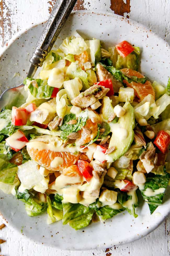 - Assemble: Toss the chicken and salad Ingredients together in a large bowl. Drizzle with dressing. If expecting leftovers, then hold avocado and dressing and add to individual servings.