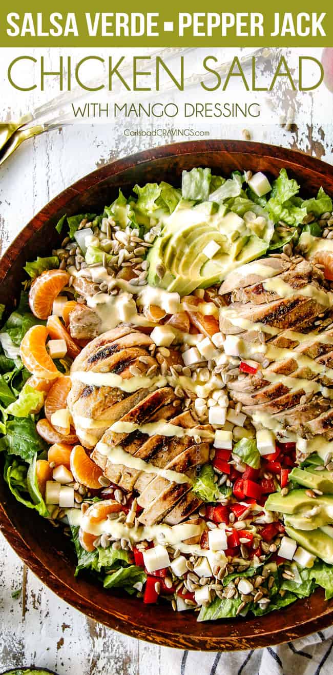 This Chicken Salad is bursting with juicy, salsa verde chicken, sweet clementine oranges, creamy avocados, crunchy bell peppers, fresh corn, salty sunflower seeds and buttery Pepper Jack Cheese all doused in creamy, sweet and tangy Mango Dressing! Its a symphony of YUM you are going to want an encore of