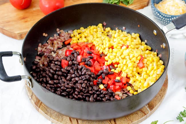 To start, saute your red onions, corn, black beans, red bell peppers and tomatoes for a couple minutes. Once tender crisp, remove so you can use the same pan.