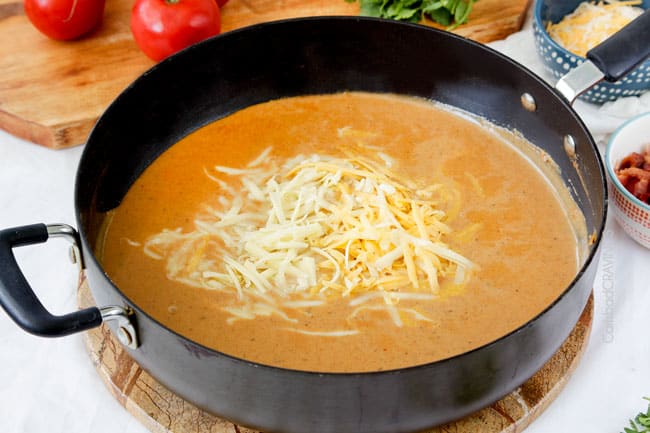 Add your mozzarella and cheddar cheeses along with your ranch seasoning cumin, smoked paprika, etc. and stir to this NO Cream, NO cream cheese, creamilicious heaven.