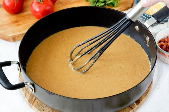 - To the same skillet, melt 1 tablespoon olive oil in 1 tablespoon butter over medium heat. When butter is completely melted, whisk in flour. Cook, while stirring, for 2 minutes, then turn heat to low. Slowly whisk in chicken broth, then milk, stirring constantly until smooth (it will be thick). Turn heat to medium high and bring the sauce to a simmer. Add Cheese Sauce spices and simmer until thickened.