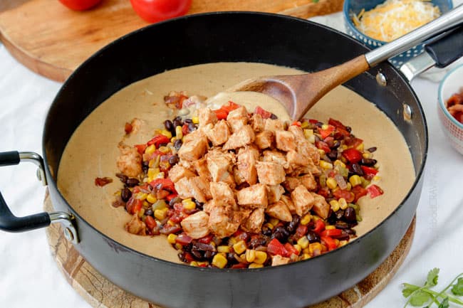 Next, add back your oven baked barbecue chicken and corn, black, beans etc., some barbecue sauce and a little sour cream….