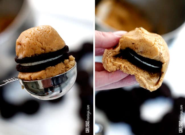 - Using a tablespoon or cookie scoop, scoop a ball of cookie dough and place it on the top of the Oreo cookie. Take a second scoop of dough and place it on the bottom of the Oreo.