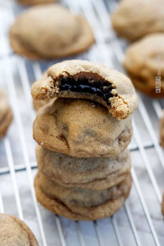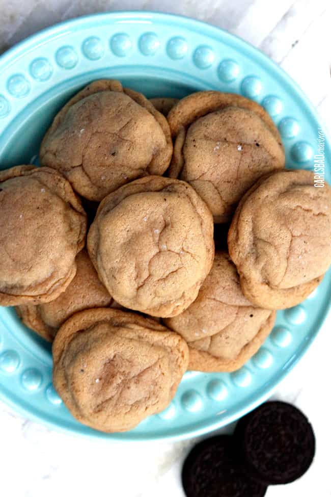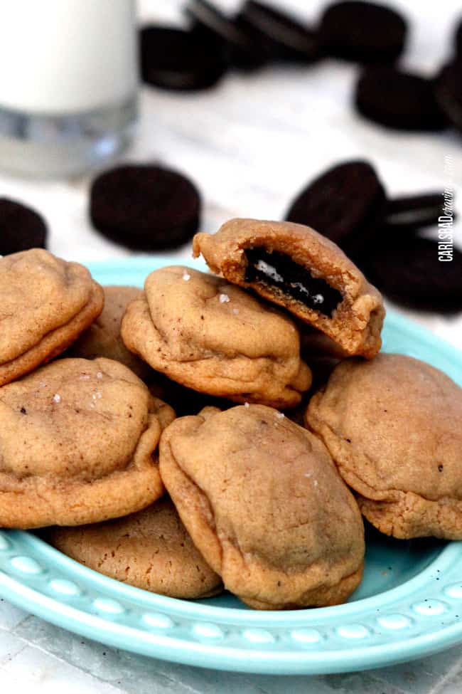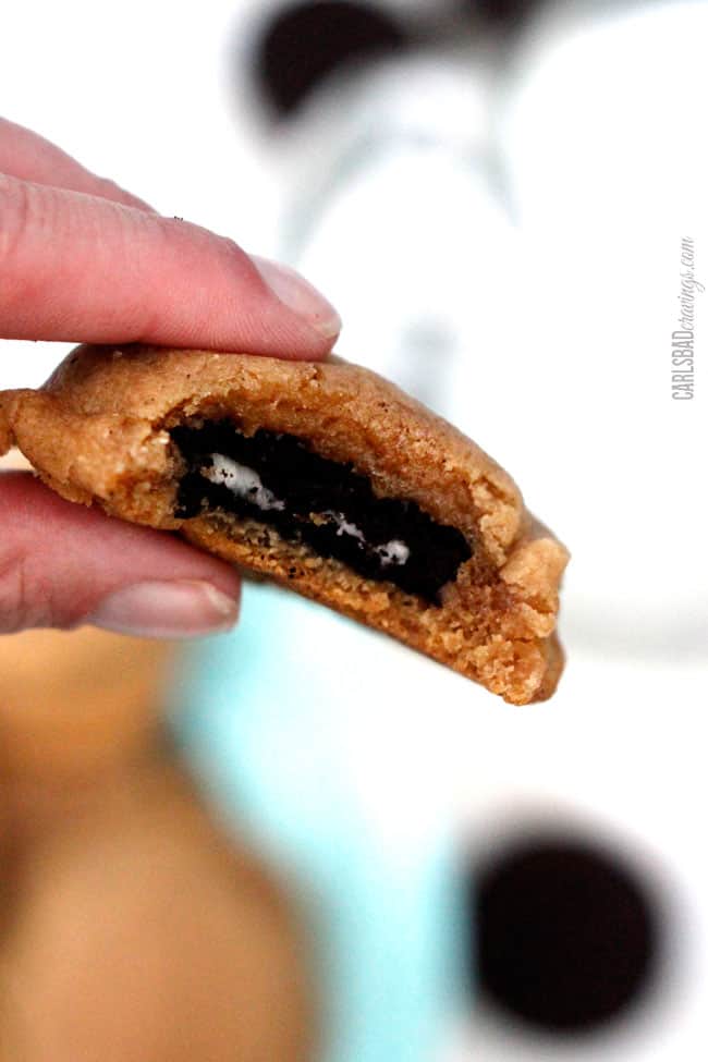 These Oreo Stuffed Cookies are epic. The Oreo “melts” while its baked so every bite is soft peanut butter cookie, soft Oreo Cookie and its melty cream, all balanced by the savory sea salt. Seriously, if ever a cookie melted in your mouth, its this one. And you want it to melt in your mouth. You want to savor every soft peanut butter Oreo Stuffed cookie crumb.