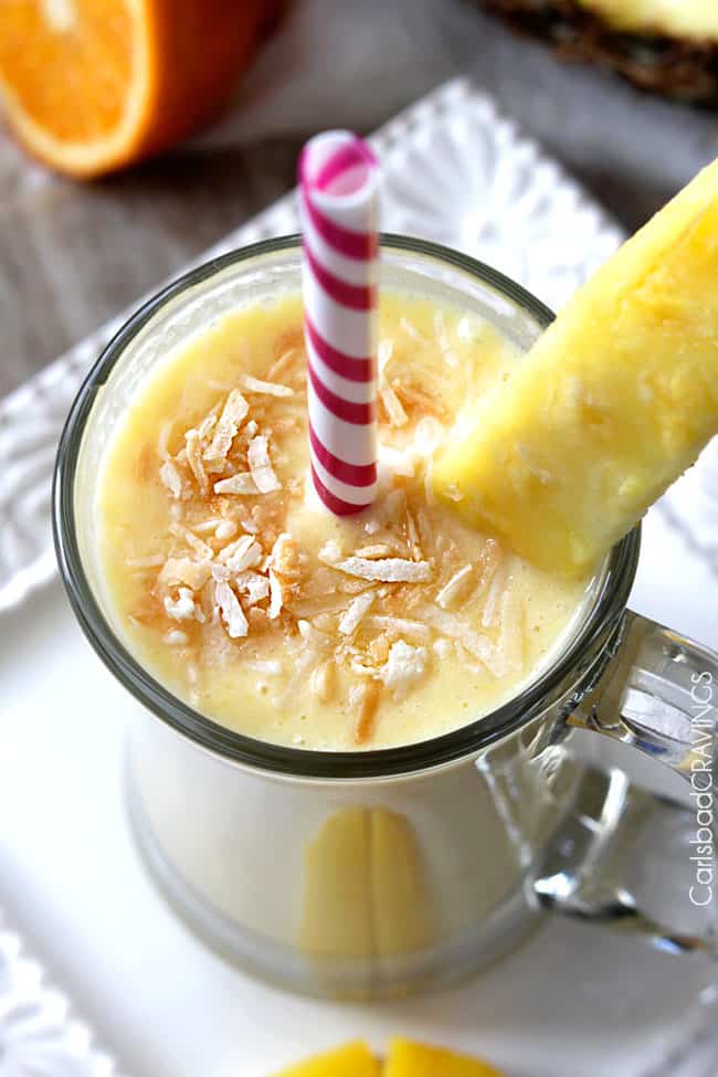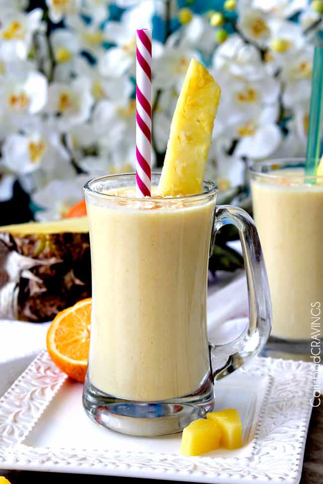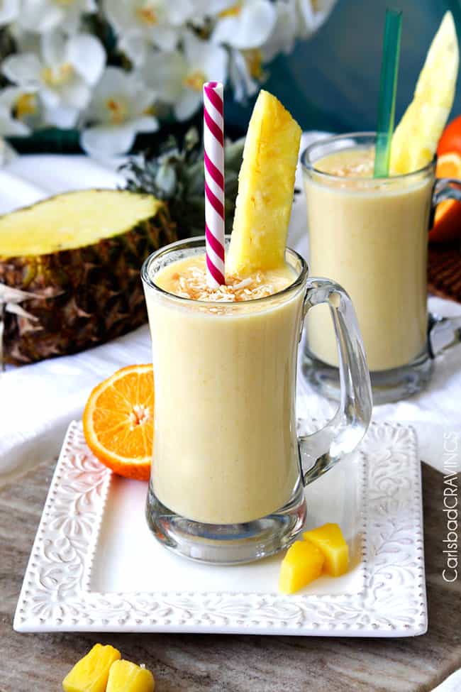 This tropical Pineapple Smoothie is made with pineapple, mango, banana, vanilla Greek yogurt, coconut milk, orange juice, and pineapple juice but it is totally customizable!