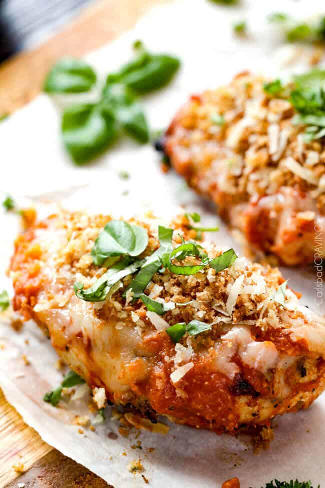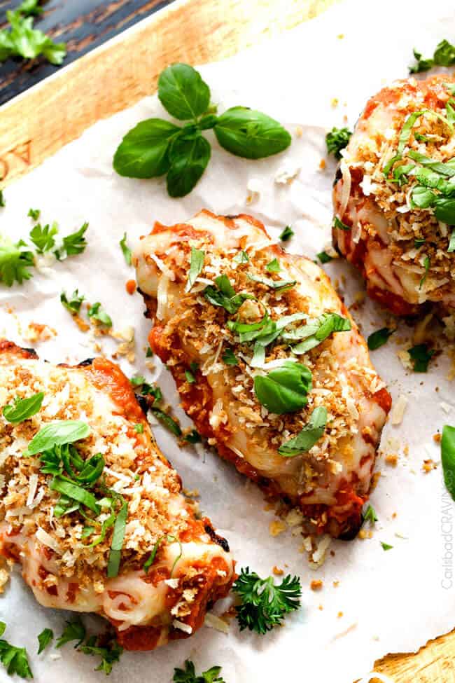 The simple marinade tenderizes the chicken and infuses it with flavor while the smooth, seasoning packed blender Marinara smothers the chicken to make it nice and saucy all blanketed in melty mozzarella cheese. The chicken gets topped with buttery Parmesan Panko that tastes just like the chicken was breaded in all its crunchy glory but all you have to do is sprinkle it on instead of breading each piece individually – LOVE this simple technique!
