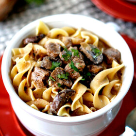 I’ve always loved beef stroganoff and chicken stroganoff, even ordering filet mignon beef stroganoff at a restaurant once (it was a special occasion), so I thought there is no better way to consume an entire bowl full of concentrated deliciousness than turn this classic into irresistiblee Beef Stroganoff Soup!