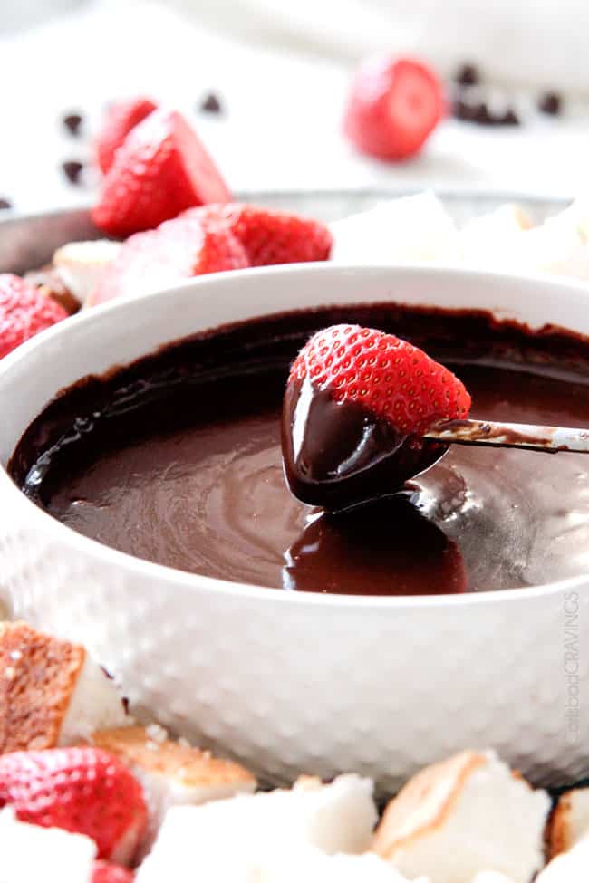 Chocolate Fondue is one of the easiest desserts you will ever make! It makes the perfect make ahead party or special occasion appetizer or dessert for Valentine’s Day, baby/bridal showers, movie night or just because! I’ve included TONS of dipper ideas, how to customize your fondue, how to reheat, freeze and what to do with leftovers!
