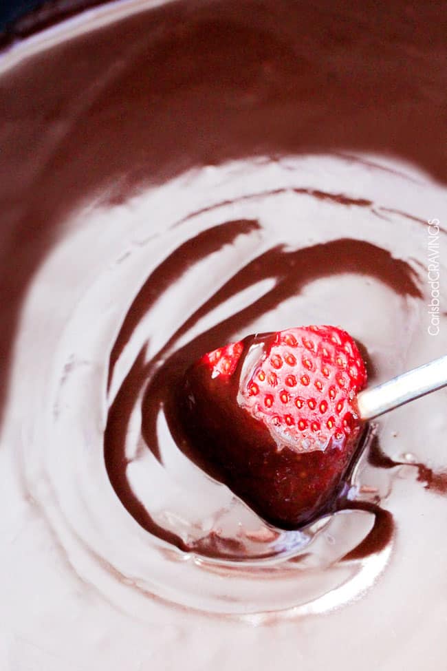 - Pay attention: Every single crockpot is different, so make sure you are paying attention to your chocolate because you don’t want it to overcook and start to burn/scald. My fondue was done in exactly one hour but it could take more or less depending on your crockpot.