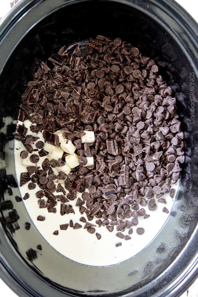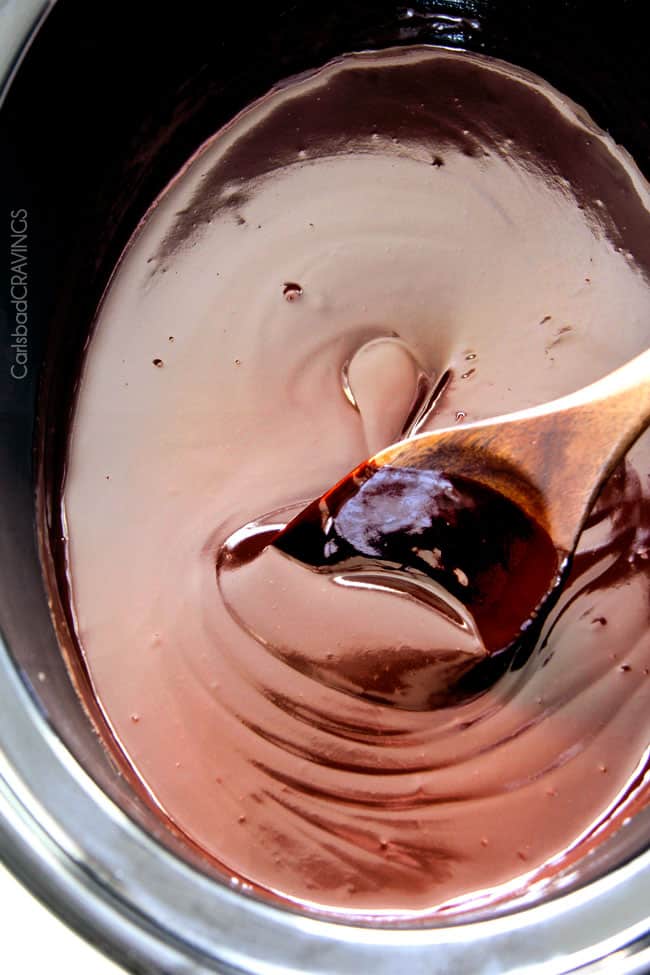 - Double or Triple recipe: You can double or triple this recipe in a 6 quart slow cooker. You will need to stir more often, about every 10-15 minutes, to ensure the ingredients melt evenly and the chocolate doesn’t burn around the edges. Depending on your slow cooker, plan on the chocolate taking an additional 20 or so minutes to melt.