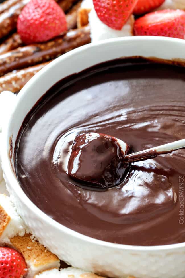 If you make your fondue in advance or need to reheat leftovers, you can reheat it gently at 50% power in the microwave, stirring frequently until warmed through. You can also reheat the chocolate in a slow cooker on LOW, stirring frequently until warmed through then turn crockpot to the WARM setting.