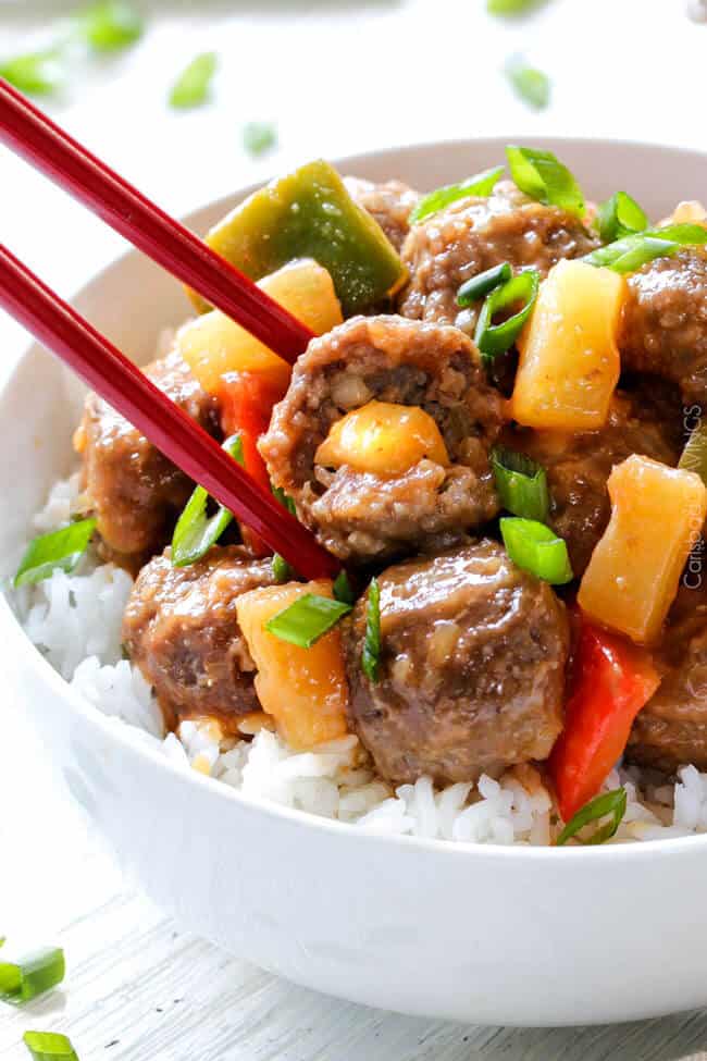 I also wanted this sauce to have the perfect consistency but adding a cornstarch slurry at the end of cooking and simmering did not produce the silky, thickened sauce we know and love. To remedy the thin sauce problem, you simply simmer the sauce for a few minutes on the stove then pour all over your meatballs, pineapple and bell peppers and then you can walk away while your home fills with the enticing aroma of the islands.