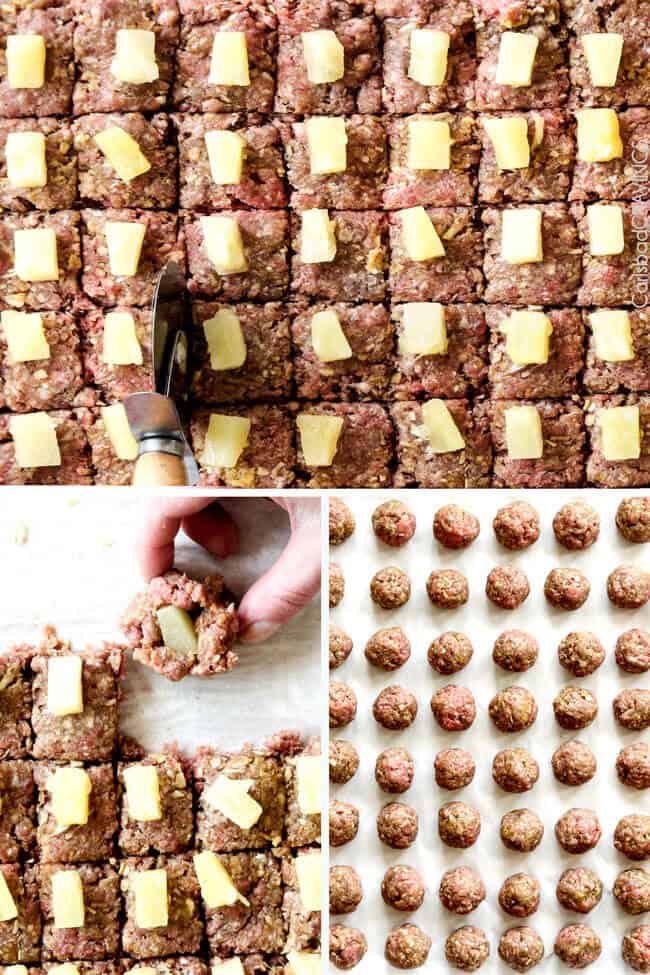 - In a large bowl, add eggs and gently whisk. Add all remaining Meatball Ingredients except pineapple chunks and mix until well combined. Shape meat mixture into an approximate 12 x 8 inch rectangle on a cutting board with even thickness. (I put parchment paper over the meat then roll with my rolling pin to form an even thickness rectangle.)