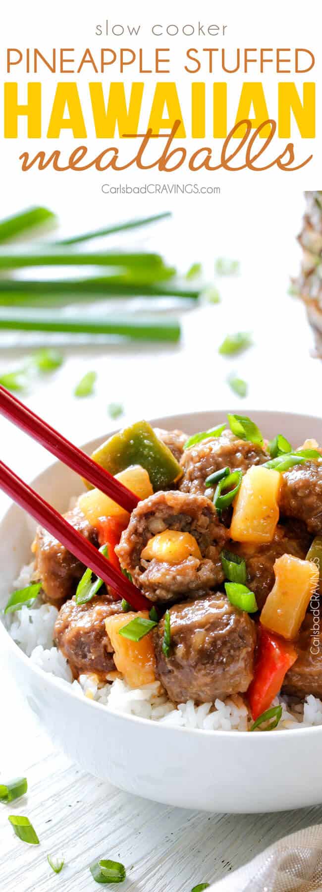 Tender Slow Cooker Hawaiian Meatballs are bathed in the most amazing sweet and tangy sauce and STUFFED with pineapple in every bite!! An incredible make ahead appetizer or family favorite dinner!