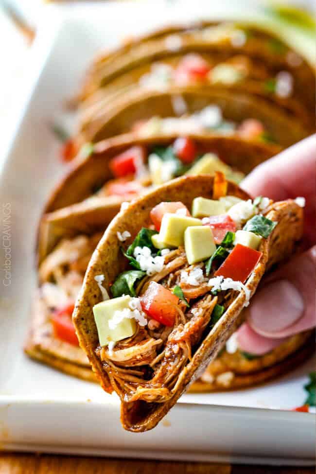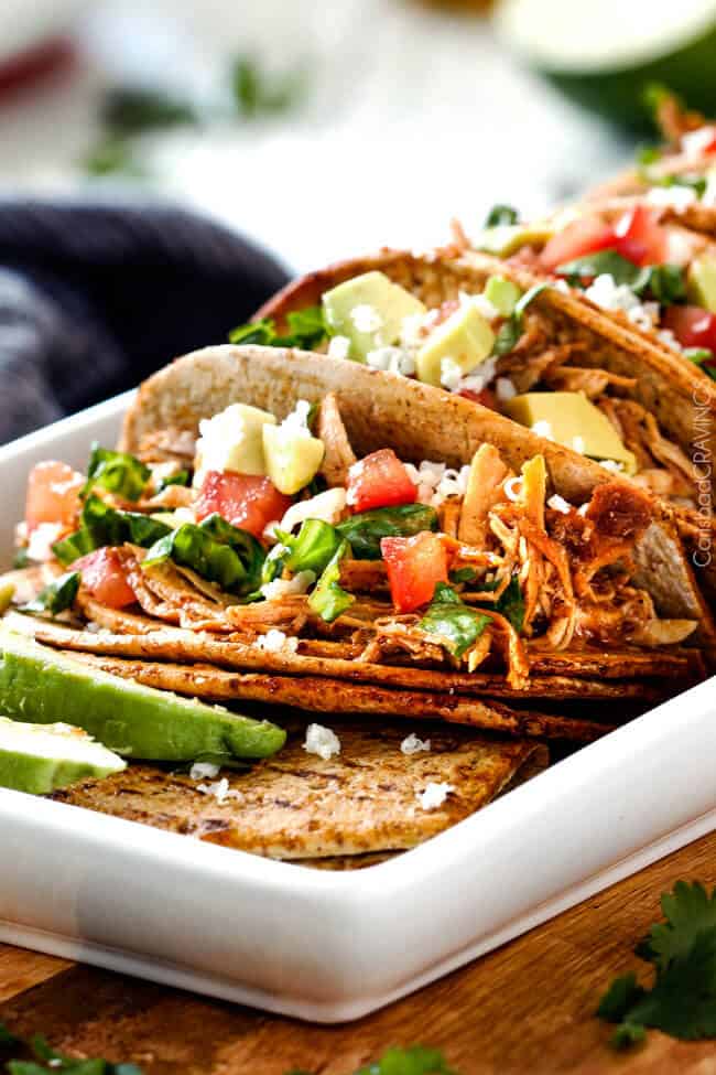Slow cooker chicken tacos are a spectacular main event that don’t need much by the way of sides. I love serving them with grilled corn, watermelon, and cilantro lime rice.