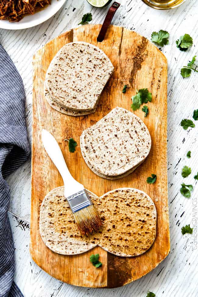 But these aren’t just any tacos, these are mini taco shells made of guilt-free Flatout Foldit Ancient Grains Flatbread that get brushed with the seasoned juices from your slow cooker then hung on the oven rungs and baked to golden crispy taco perfection (see video of technique HERE, and start dreaming of the seasoned taco shell possibilities! BBQ Sauce, Pesto, Buffalo Sauce, etc.). The shells are hearty, crispy on the outside while still tender on the inside, perfect to cocoon Salsa Verde Honey Lime Chicken piled high with cheese, lettuce, tomatoes, avocados, sour cream. And perfect to eat 5 in one sitting. At least.